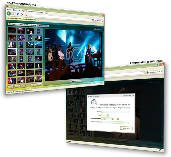 - La publicación de las fotografías se realiza en atractivas galerías, visualizadas desde la página web del cliente y alojadas sobre la plataforma de FOTOFLASH.